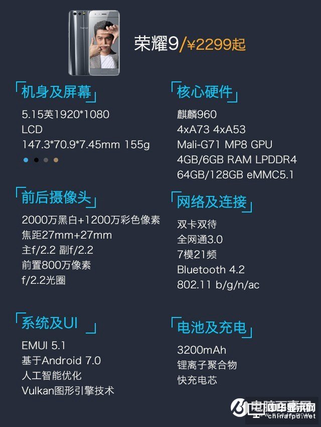 先來看參數(shù)部分,榮耀9主打小屏,售價(jià)2299元起,相比小米6、一加5、努比亞Z17、OPPO R9等熱門旗艦機(jī)價(jià)格更便宜一些,在今年的國產(chǎn)旗艦機(jī)中,價(jià)格屬于相對(duì)比較親民的了。
