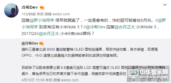 今天,較早爆料小米Note 3的業內人士@冷希Dev在微博上透露了小米Note 3的相關消息,他在微博中透露,小米Note 3將繼續搭載OLED雙曲面顯示屏,如果小米研發部門速度較快的話,小米Note 3將在8月份與大家見面。