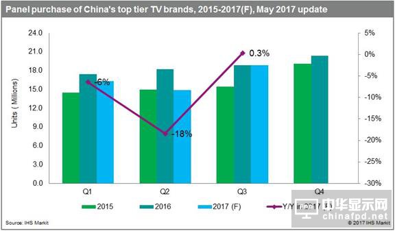 不過展望未來,電視品牌為了實現其2017年出貨目標,其面板需求在第三季度有望回升——韓國和中國領先電視制造商的面板采購量環(huán)比預計會分別增長25%和27%。