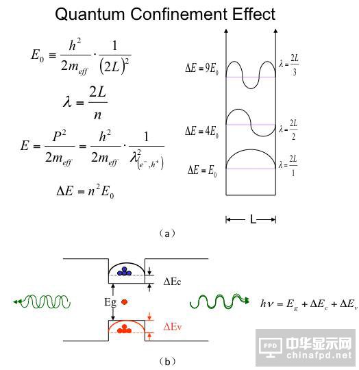 在微觀世界里,尤其是在納米尺度之下,所有的光與電的現象,都會與我們看到的大尺度世界那么的不同,如圖二(a)所示(公式看不懂可以跳過去),根據薛定諤方程式波函數的解,在量子尺度(L)下,尺度的不同,電子與空穴所處的能量狀態△E也會不同,也許它會在能級Eo的位置,也許會在4Eo的位置,也許在9Eo或16Eo…..,因為物理尺寸的不同,材料中電子的能級也會相應的變化,所呈現的材料特性就會與原本的材料本性差異極大,如圖二(b)所示,此時發光的能量或頻率就不再是材料本身的能帶隙性質Eg,而是帶隙較寬的(Eg+△Ec+△Ev),能量變強發光波長因此會變短,這樣因為電子與空穴被局限在納米材料內形成自組的穩定態,造成光電性質的改變,這樣的效應我們稱為量子局限效應。