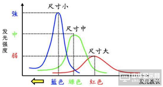 量子局限效應最明顯的特征是納米材料的尺寸愈小時,材料發光能量愈強,能量越強表示發光的波長愈短(藍色),這個現象稱為「藍移(blue shift)」。