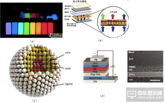 最常見的量子點結構如圖六(c)所示,一般包含無機半導體核心層(core,直徑約1~10nm)、寬帶隙無機半導體殼層(Shell),以及最外層的有機配體(Ligand),核心層是量子點主要發光層,使用不同種類材料例如CdSe、CdS、InP與ZnSe ,合成不同的尺寸大小,可以調整量子點發光的顏色,利用合成的時間、溫度以及反應物的濃度,加上合成后的過濾篩選,可以使量子點的大小更一致且均勻,發出更純的光色。殼層包復核心層,隔絕氧氣與濕氣,并修補核心層缺陷,提升發光效率,最外層的有機配體可以使量子點分散在不同的非極性有機溶劑中,有利于使用溶液制程來制作量子點發光器件。