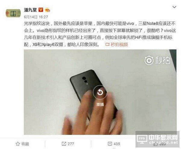 具體配置目前并未清楚,但就不久前博友潘九堂上傳微博的一則短視頻爆料,VIVO隱形指紋技術的樣機已出,直接按下屏幕就能解鎖了!這樣一來不難理解VIVO X11極有可能配備這一項黑科技!