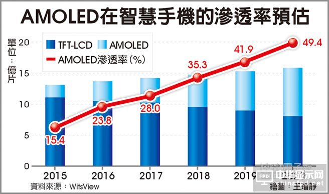 新一代蘋果iPhone手機確定將採用三星AMOLED面板,因此吸引全球各家大廠搶進AMOLED市場,市調機構WitsView出具最新報告預估,AMOLED在智慧手機的滲透率可望在2020年飆近50%,而這一波投資熱潮以中資最積極。至于韓廠樂金顯示器(LGD)的6代可撓式產線將供應非蘋客戶,則最具指標意義。
