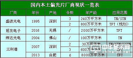 據統計,現有本土企業在偏光片領域生產規模偏小,主要廠商有盛波光電、三利譜 、富鴻電子、緯達光電、旭友電子、樂凱等。這些企業大都批量供應中低端TN-LCD用偏光片和部分STN-LCD用偏光片,主要應用在各類精密儀器儀表盤、眼鏡、電子詞典、MP3、MP4、手機、數碼相機、平板電腦等中小尺寸領域。相反,電腦、液晶顯示器、電視機等高端產品的偏光片還是要從日本、韓國或臺灣地區進口。雖說偏光片用功能膜材料只有TN-LCD或部分STN-LCD的TAC膜部分實現了國產化,但其他偏光片用原材料則全部依賴進口。