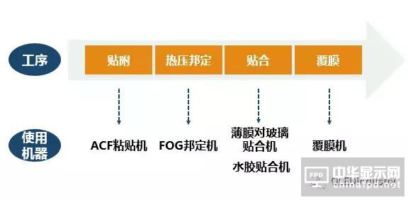 模組組裝工序:是將觸控感應(yīng)板和玻璃蓋板組裝形成觸摸屏的過程,主要生產(chǎn)工序包括貼附、熱壓、貼合、覆膜等。根據(jù)原材料的不同,貼合工藝可分為薄膜對(duì)玻璃貼合、玻璃對(duì)玻璃貼合、水膠貼合等類別。