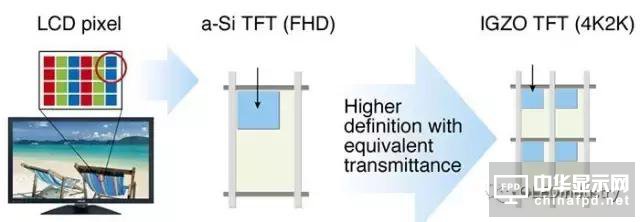 改用IGZO后TFT 內的元件可以造得更細更小,在同一的面積下,原先只能夠容納一組 a-Si 非晶硅的 TFT ,但因為 IGZO 技術令 TFT 部份更精細,因此能夠容納 4 組 IGZO TFT ,顯示不同的色彩及像素點。