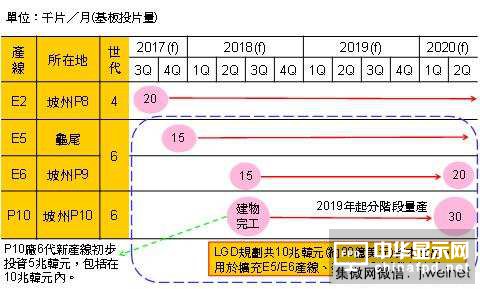 LGD計(jì)劃2017年下半至2020年上半3年內(nèi)編列10兆韓元(約98億美元)資本支出在可撓式中小尺寸OLED事業(yè),其預(yù)定2017年底與2018年中分別啟用龜尾6代E5及坡州P9廠6代E6產(chǎn)線,并于P10廠建構(gòu)1條6代可撓式OLED新產(chǎn)線, 目標(biāo)為2020年6代可撓式OLED面板月產(chǎn)6.5萬(wàn)片,相當(dāng)于一年可供1.2億支6吋智能型手機(jī)搭載使用。