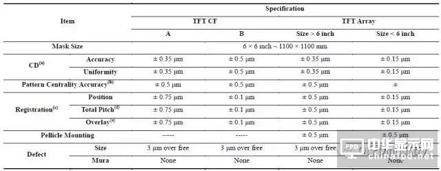 TFT 和CF 的精度不同, 所以對(duì)Photomask 的品質(zhì)規(guī)格要求也有差異(Table 4)(10)。