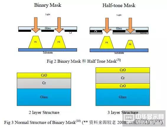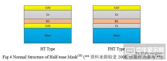 在Display 生產(chǎn)中, 主要使用的是石英/蘇打玻璃+鉻膜(Cr + CrO) 的Photomask 形式 (Table 3) (3)。根據(jù)透過性的不同, Photomask 可以進(jìn)一步被分為Binary Mask 和Half Tone Mask (3):