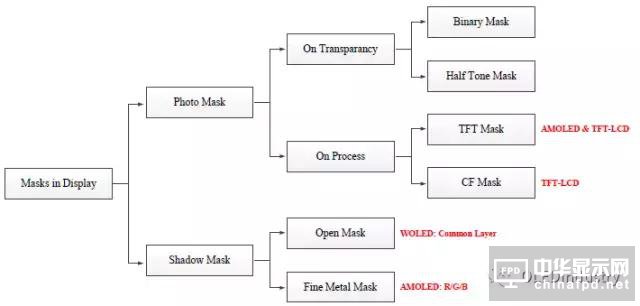 Display 產(chǎn)線上使用的Mask 為兩種: Array 段和CF 段(TFT-LCD)用的, 以玻璃為基礎(chǔ)材料的曝光Photomask; 和AMOLED 段以金屬為基本材料的Shadow Mask (Open Mask & FMM)。