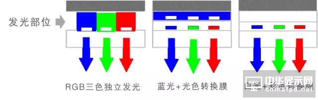 | 方式 | RGB 三色獨立發(fā)光 | 藍光+光色轉換膜 | 白光+彩色濾光片 |