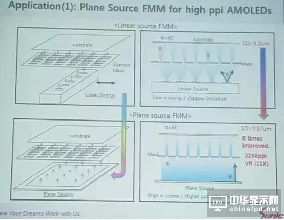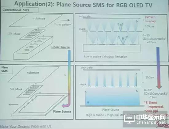Sunic System宣稱在使用平面蒸鍍源后,由于材料幾乎是垂直蒸鍍上基板,和高ppi AMOLED面板的原理一樣,可以最小化混色的風險。