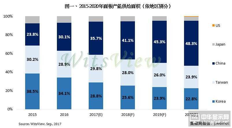 根據(jù)集邦咨詢光電研究中心(WitsView)最新數(shù)據(jù),從面板產(chǎn)能供給面積的地區(qū)別來看,2017年中國(guó)大陸將正式超越韓國(guó)成為大尺寸面板供給面積最大的地區(qū),預(yù)估2020年中國(guó)大陸供給率將朝50%邁進(jìn)。