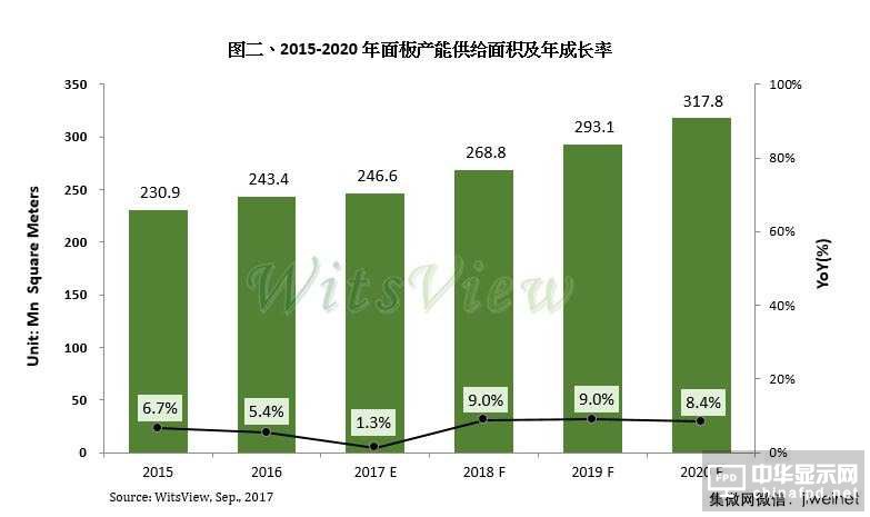 受到韓廠收斂產(chǎn)能影響,2017年全球大尺寸面板產(chǎn)能面積估達(dá)2.47億米平方,年增長(zhǎng)僅1.3%,為近2-3年增幅最少的一年。不過隨著2018年至2020年將有六條10.5代線產(chǎn)能陸續(xù)開出,將帶動(dòng)產(chǎn)能面積快速增長(zhǎng),預(yù)期2018-2020年大尺寸面板產(chǎn)能面積成長(zhǎng)率每年將以8-9%的速度增加,至2020年總面積將達(dá)3.18億米平方。