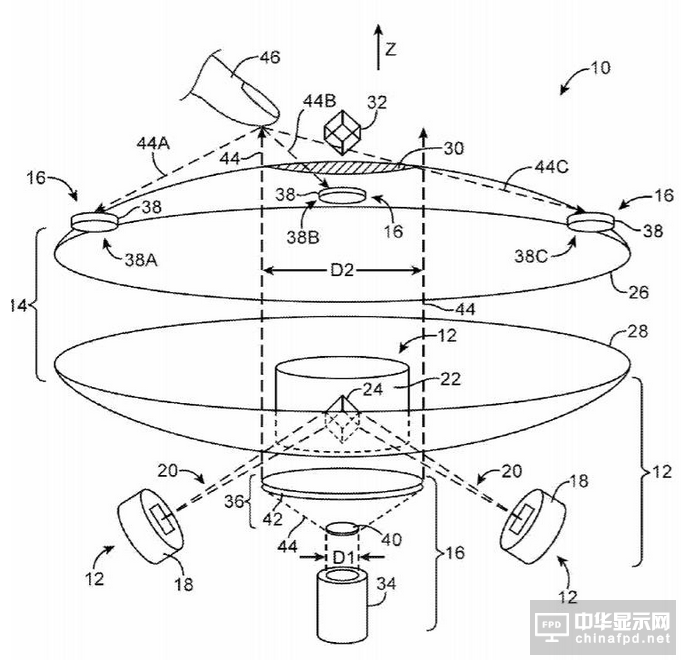 以上專利申請叫做“交互式三維顯示系統(tǒng)”,詳細說明了一種可由用戶在空中進行操作,并無需借助特殊眼鏡的圖像顯示系統(tǒng)。該申請?zhí)峤挥?012年10月,可應用在教育、醫(yī)療診斷、生物醫(yī)學工程領域。