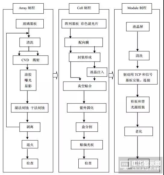 TFT-LCD為代表的顯示面板生產(chǎn)過程主要分為三個工序: