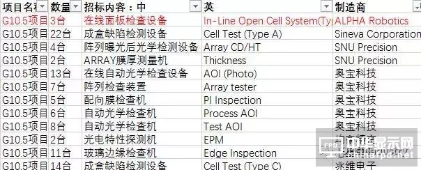 本次招標中,出現了3臺/套在線面板檢查設備In Line Open Cell AMT,該設備目前有三家廠商可以提供,分別為DONG A ELTEK、ALPHA Robotics和昆山精訊。AMT是一條比較完整的模組端線,解決了人力問題、品質問題,一條線替代了幾十個人。