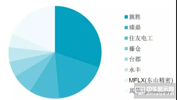 從營業收入規模來看,全球FPC 大廠主要集中在日臺,日本旗勝、住友、藤倉和臺灣臻鼎、臺郡位居前五,占了全球72%的市場份額。