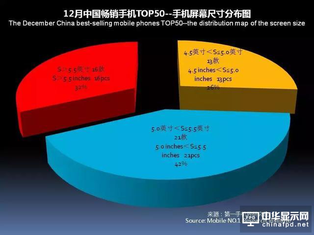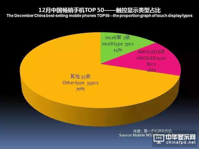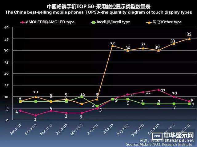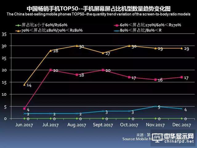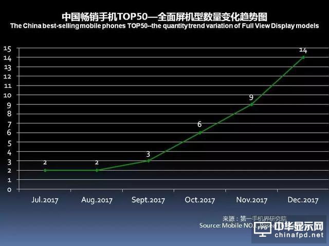 12月中國暢銷手機TOP 50中,采用AMOLED屏下降至8款,說明全面屏已開始取代AMOLED成為手機賣點。