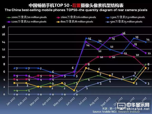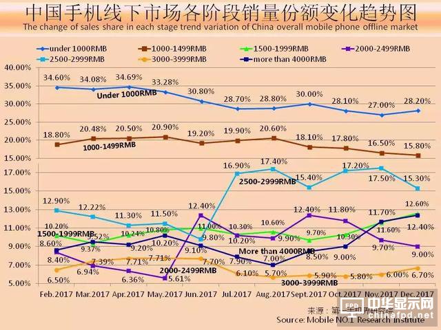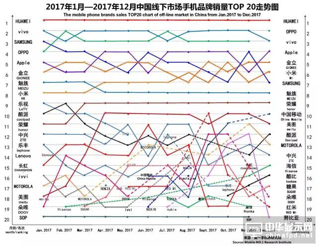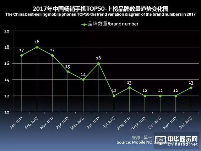 根據七星手機連鎖、話機世界、廣西王者通訊、四川龍翔通訊、廣東麗的通訊、廣東新星源手機數碼連鎖、黑龍江省凌志手機連鎖、海南王者天創、山西太通科技、山西遠大通訊、湖南齊欣通訊、江西麗華通訊、湖北九鼎通訊、吉林天天手機、云南九機網、甘肅悅達、陜西中人、河南兄弟通訊商會、河南國宇、河南勝天、江蘇國網、河北潤德、廈門中橋、迪信通、貴州誠訊、華偉通訊、大地通訊、重慶祥佳音、河北國通等全國手機連鎖賣場銷售數據統計結果顯示,2017年12月在中國線下渠道銷售的手機品牌達到111個,環比11月112個,減少了1個;12月有一定銷量的手機機型達到86款,環比11月77款,增加了9款。