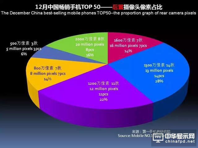 12月暢銷手機TOP 50中,后置攝像頭采用2000萬像素的有8款,占比16%;采用1600萬像素的有7款,占比14%。