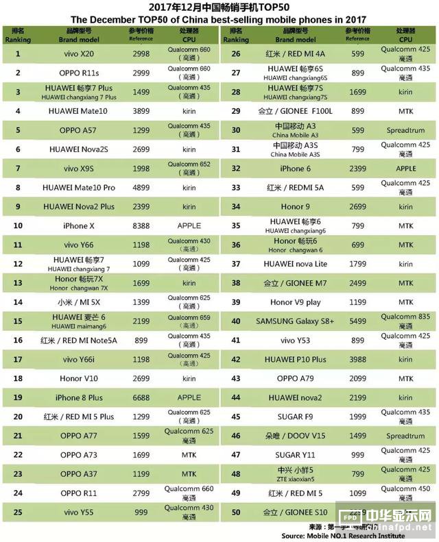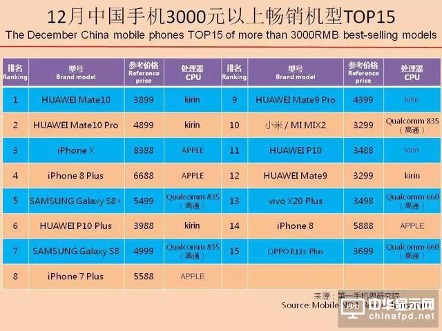 vivo X20、OPPO R11s、華為 暢享7 Plus、華為 Mate10、OPPO A57、華為 nova2S、vivo X9S、華為 Mate10 Pro、華為 nova2 Plus、iPhone X成為12月中國暢銷手機TOP 10。