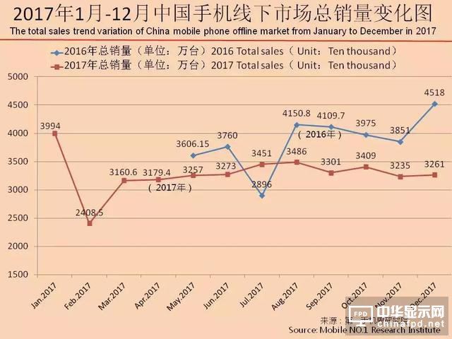 第一手機界研究院根據覆蓋全國25個省/直轄市/自治區221個城市,10034家線下手機實體店的銷售數據統計結果計算,2017年12月中國大陸整體手機線下市場共完成銷量3261萬臺,同比減少27.8%,環比11月增長了0.8%。