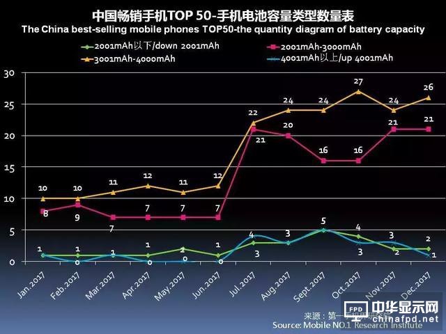 續航能力已經成為手機賣點之一,12月中國暢銷手機TOP 50中,電池容量3001mAh-4000mAh的機型數量已達到26款。(來源:第一手機界)