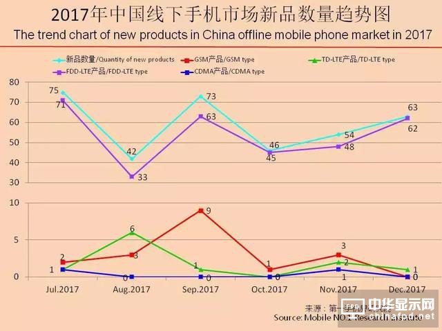 2017年12月,中國大陸手機線下市場共有63款新品推出,1款TD-LTE和62款FDD-LTE產品。
