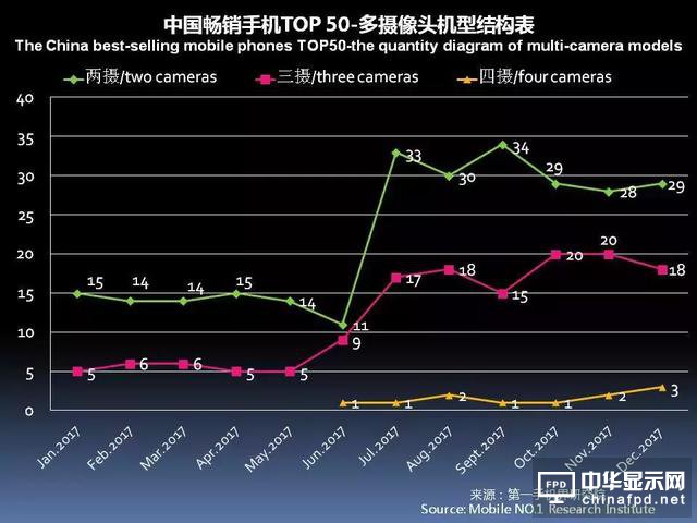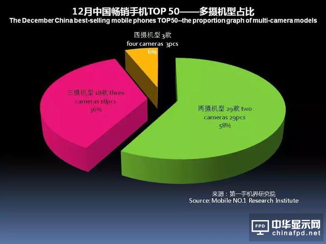 12月中國暢銷手機TOP 50中,已有22款機型采用多攝像頭設計,占比44%。