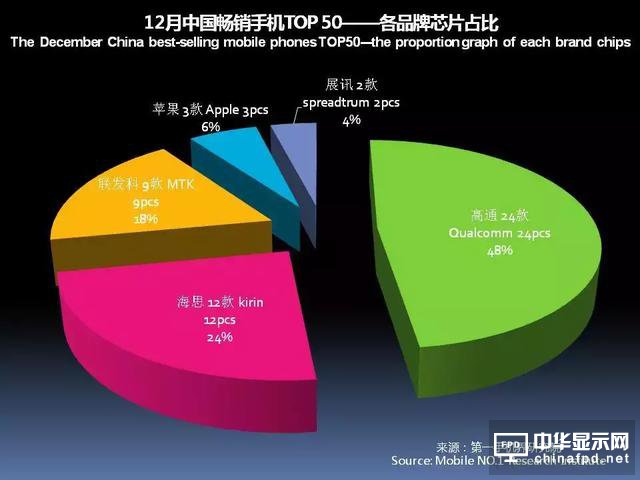 12月中國暢銷手機TOP 50中,采用高通芯片的有24款,聯發科(MTK) 9款,海思12款,蘋果3款和展訊2款。高通芯片占有率達48%的份額。