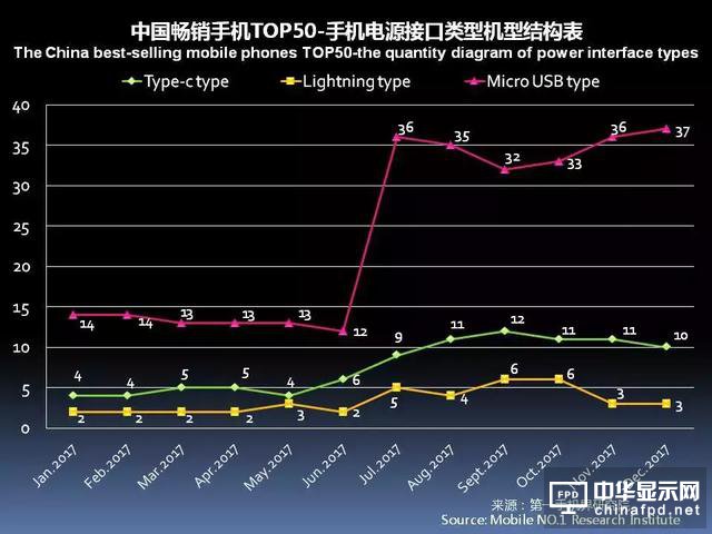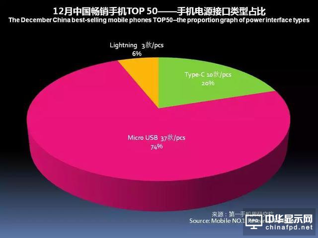 12月中國暢銷手機TOP 50中,采用Type-c接口的機型已達到10款。