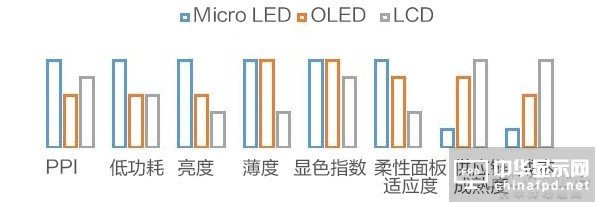 相比起LCD和OLED,Micro LED擁有無機LED高效率、高亮度、高可靠度及反應時間的優點,而且也更容易實現節能效果。