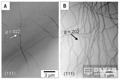 掃描透射電子顯微鏡下觀察不同狀態(tài)硫化鋅中的位錯(A)原始樣品(B)黑暗中變形后的樣品,其中顏色較深的“蜿蜒細(xì)線”就是位錯。可明顯看出黑暗中樣品的位錯更為密集。圖片來源:參考文獻(xiàn)[1]