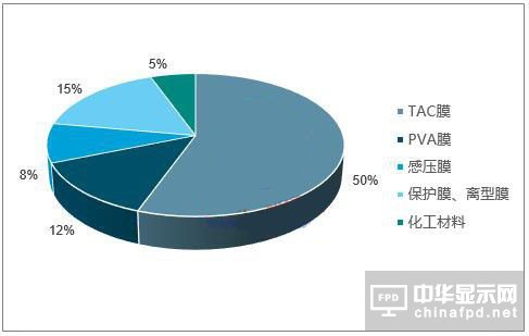 偏光片是將聚乙烯醇(PVA)拉伸膜和醋酸纖維素膜(TAC)經多次復合、拉伸、涂布等工藝制成的一種復合材料,可實現液晶顯示高亮度、高對比度特性。由于其生產技術匯集了高分子材料、微電子、光電子、薄膜、高純化學及計算機控制等多種技術,因此具有較高的技術含量。傳統偏光片主要由TAC膜、PVA膜、感壓膠、保護膜和離型膜組成,其中TAC約占成本50%左右,起到支撐PVA膜、保證偏光片環境耐候性等作用。通常1張偏光片需要使用2張TAC功能膜。