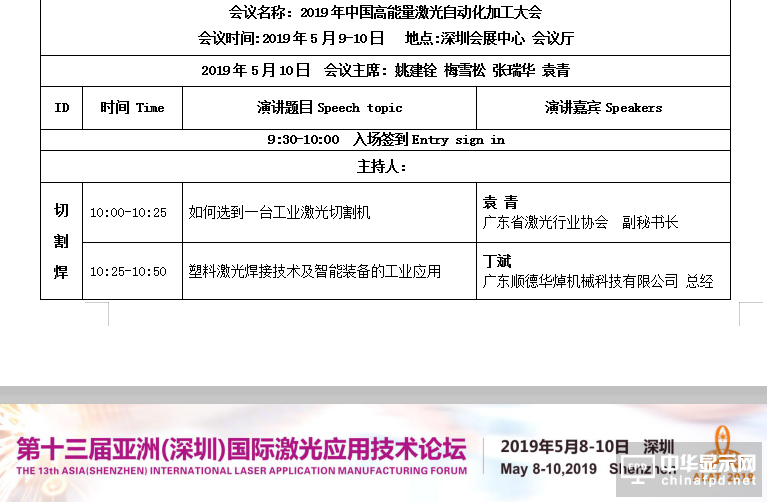 “2019年中國高能量激光自動化加工大會”將于2019年5月9-10日在深圳會展中心舉行。會議期間將有來自激光科研院所的專家、知名企業的負責人與高級工程師作演講報告,同時我們邀請到眾多激光應用工程師參與會議交流。
