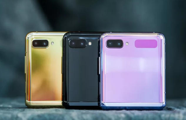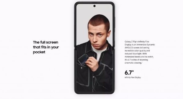 這款手機采用 “懸空折疊鉸鏈” 結構,打開任一角度都能正常使用,展開后的屏幕尺寸為 6.7 英寸,屏幕材質為 Dynamic AMOLED 超薄柔性玻璃,折疊后的小屏幕僅 1.1 英寸,可用于顯示時間和提醒等信息。Galaxy Z Flip 提供黑色、紫色、金色三種顏色。