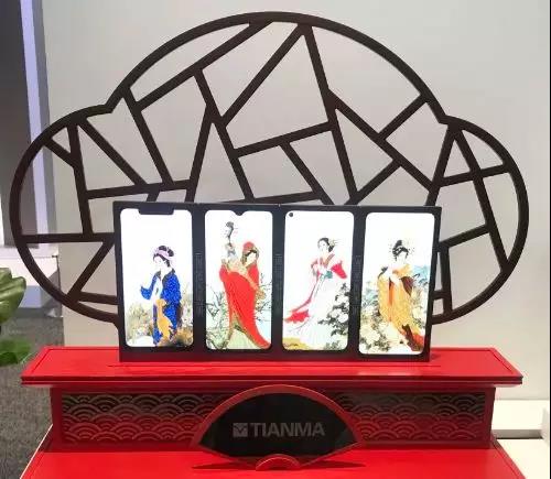 中國古典屏風四聯屏,由6.18英寸notch屏、6.3英寸水滴屏、6.4英寸極點屏和6.53英寸全視屏拼接而成,四款不同類型的LTPS LCD全面屏產品各具特色,展現了科技與古典之美,更展現了天馬在全面屏領域的歷史與實力。