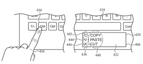 而在這份專利中,蘋果選擇在鍵盤的空格鍵和筆記本的觸控板中添加一個輔助顯示屏,輔助顯示屏僅顯示一些與鍵入的文字相關(guān)聯(lián)的單詞或詞組,或者是對單詞的一些聯(lián)想。此外,當(dāng)用戶按下Ctrl、Alt這樣的功能按鍵時,顯示屏也能夠顯示一些按鍵組合的功能。