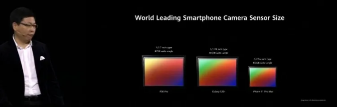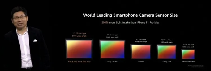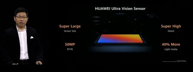 華為P40系列上的5000萬像素主攝,采用1/1.28英寸大底,單像素面積達1.2μm,四合一等效像素為2.4μm,同時延續了華為P30系列以及華為Mate30系列上的RYYB陣列,配合超感傳感器和第五代ISP、達芬奇架構NPU、自研感光和處理算法等帶來超高的感光度。