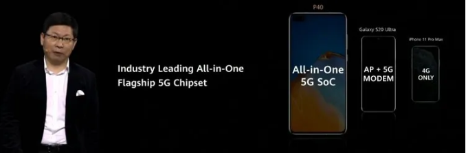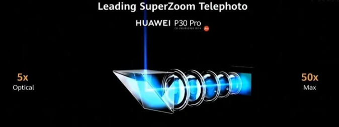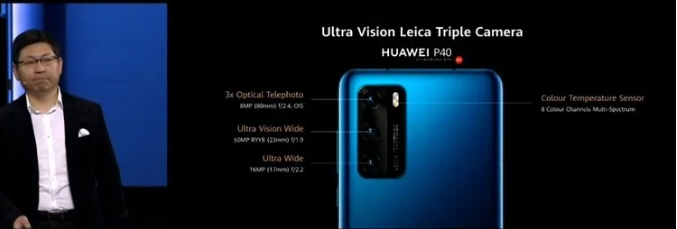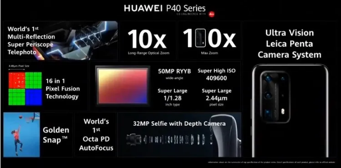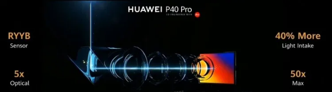 華為 P40 Pro上采用潛望式長焦鏡頭,支持5倍光學變焦、10倍混合變焦、以及50倍最大變焦。同時首次在長焦上加入RYYB陣列,支持4K延時攝影。