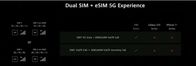 性能配置上,華為P40系列新機搭載麒麟990芯片,支持雙模5G網絡。同時華為P40系列支持雙卡,支持eSIM,支持NM存儲卡。并且支持WiFi 6+,下行速錄高達2400Mbps。