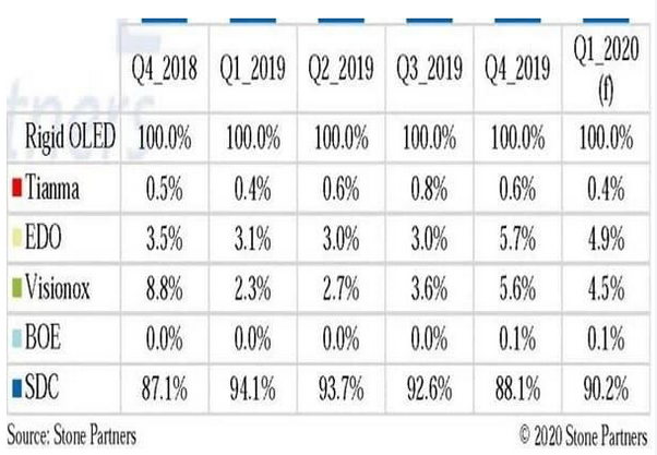 來自Stone Partners的統計顯示,去年底,三星Display在智能機OLED面板出貨中拿到了88.1%的份額,高居第一。