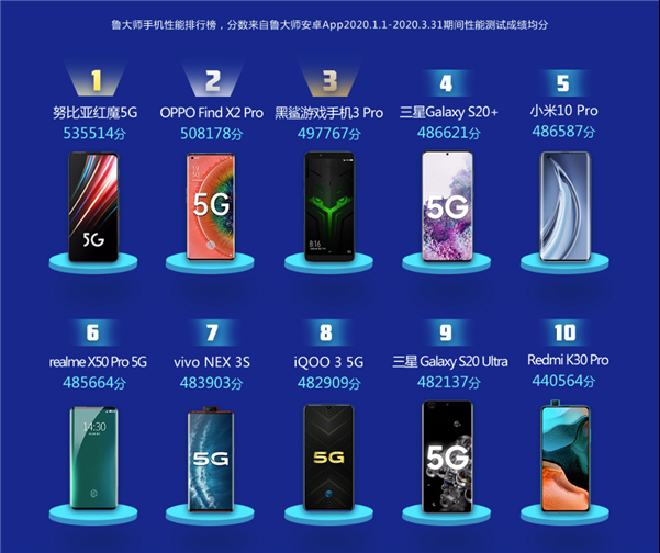 榜單顯示,努比亞紅魔5G以535514分的成績位列榜單第一,OPPO Find X2 Pro以508178分緊隨其后,成為第二款破50萬分的手機。黑鯊游戲手機3 Pro則以497767分第三。