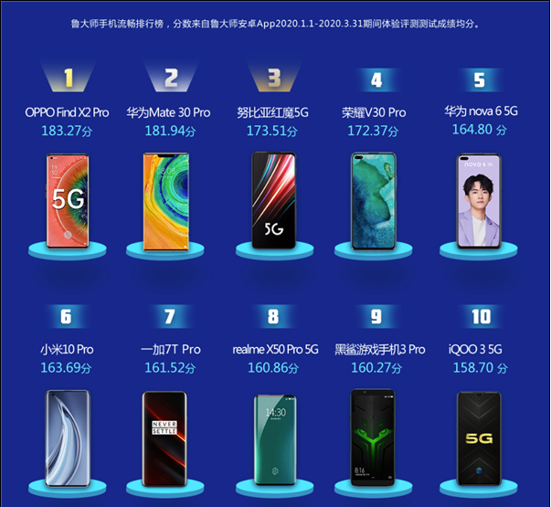 一同發布的還有Q1手機流暢榜。其中,OPPO Find X2以183.27分高居榜首,華為Mate 30 Pro排名第二(181.94分),努比亞紅魔5G第三(173.51分)。