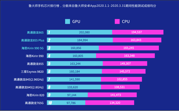 在手機芯片榜中,驍龍865、驍龍855 Plus、麒麟990 5G前三。此外,麒麟990、三星Exynos 9820、驍龍845(2.96GHz)、驍龍845(2.8GHz)、麒麟820、驍龍765G也躋身TOP10。