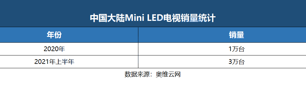 在主流電視品牌的推動下,Mini LED電視概念火熱,但是市場表現(xiàn)卻不如預(yù)期。奧維云網(wǎng)報告指出,2020年Mini LED電視銷量達(dá)1萬臺,2021年上半年Mini LED電視銷量僅3萬臺。奧維云網(wǎng)已經(jīng)將2021年Mini LED電視市場規(guī)模從25萬臺降至15萬臺左右。GfK更加不看好Mini LED電視市場,甚至預(yù)計(jì),2021年中國Mini LED電視的零售量規(guī)模僅為7萬臺。