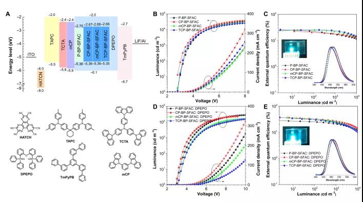 在非摻雜和摻雜的天藍(lán)光 OLED 中可分別實(shí)現(xiàn)高達(dá) 26.1% 和 38.6% 的外量子效率,是目前文獻(xiàn)中所報(bào)道的最高值。