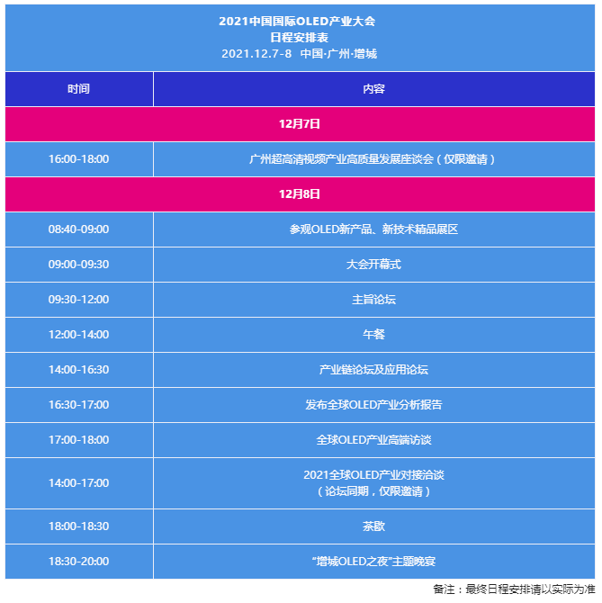 為進一步推動廣州市新型顯示產業高質量發展,中國國際OLED產業大會組委會聯合全球顯示學/協會、學術研究機構和OLED產業領軍企業,以“OLED引領產業新動能”為主題,將于2021年12月7日-8日在廣州增城舉辦“2021中國國際OLED產業大會”。